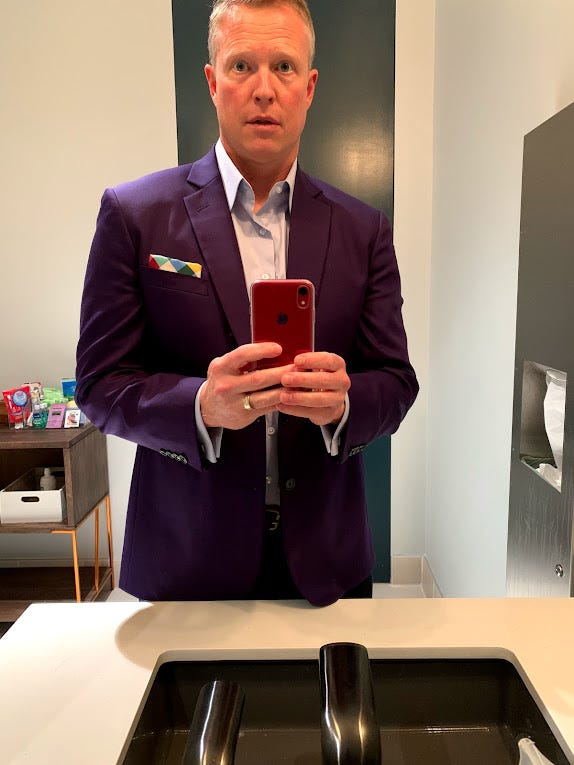 I had a purple jacket made. I also had some dress shirts made. When the tailor asked me if I wanted my personal initials on the cuff I declined, then asked, could I have anything on there? Anything that’s 3 letters, I learned. I had OMG embroidered to peak out and remind me to keep my sense of wonder. I wore my Slack socks.