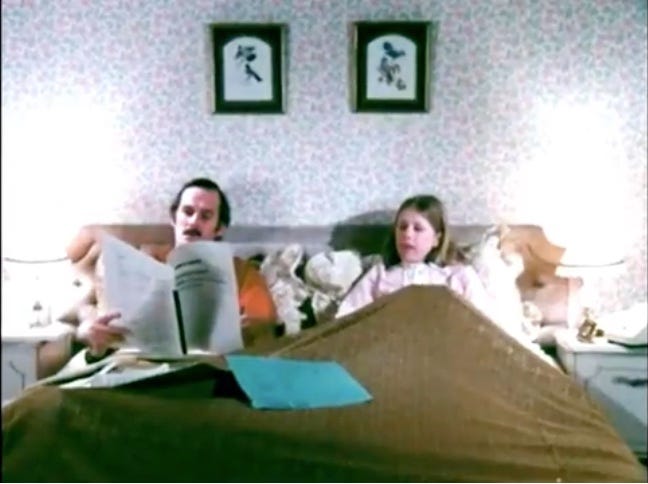 (Intro: John Cleese, in bed with his wife, complaining about meetings. In his papers, his wife has found a court summons for speeding and reminded Cleese to be on time for a family commitment on the same day.)