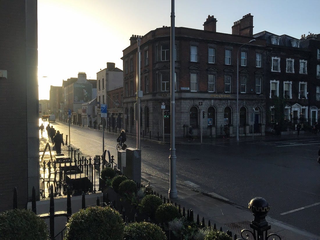 I woke the next morning to slanting sunshine and wet streets. The rain had just passed and the sun shone at an acute angle along the stone and brick buildings, casting long shadows from a passing cyclist onto empty streets in front of St. Stephen’s Green.