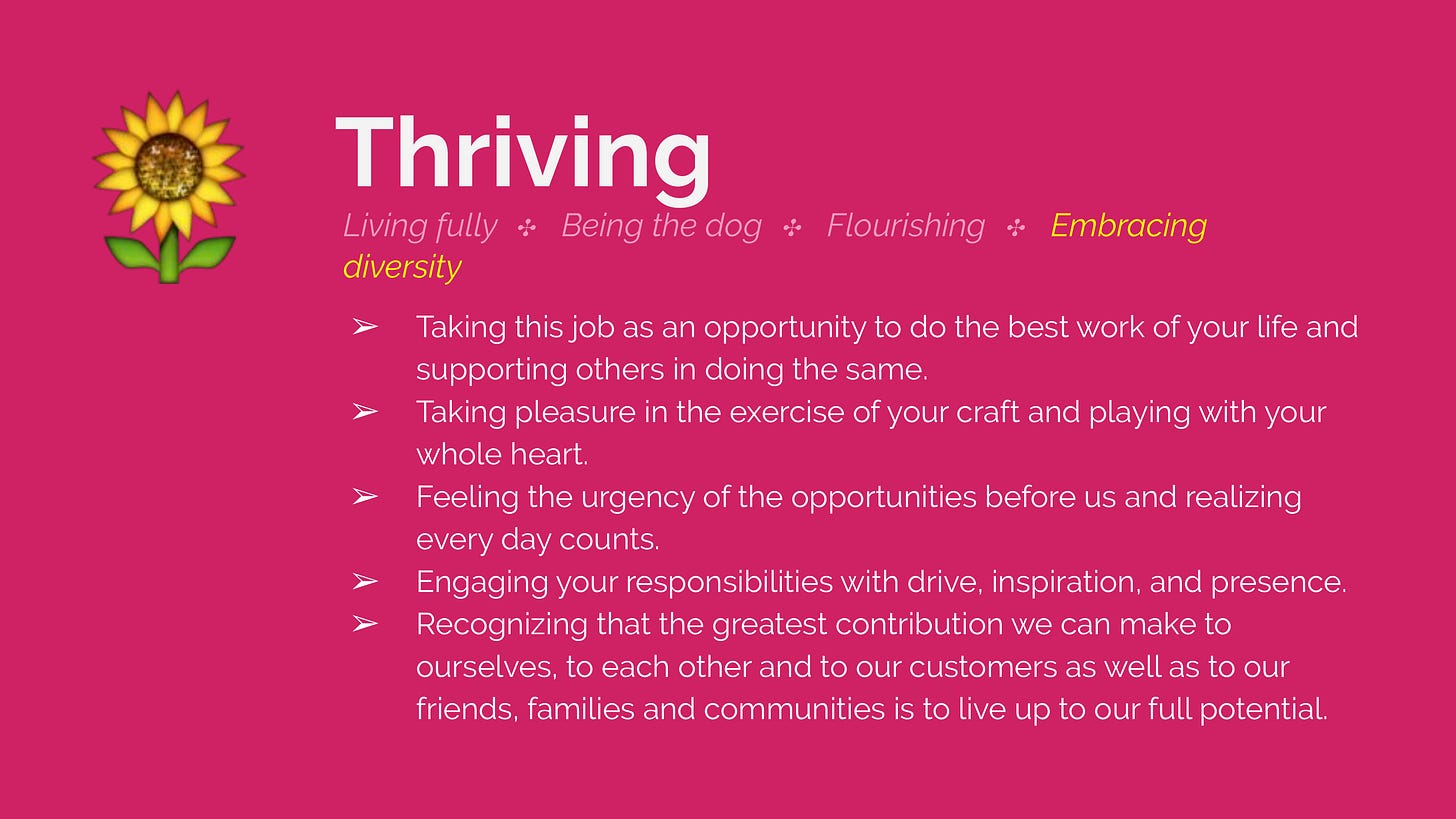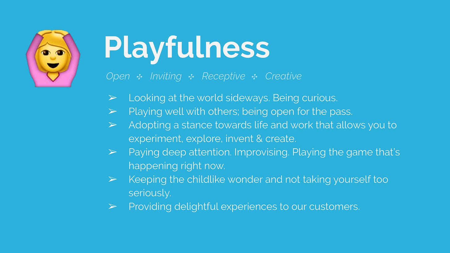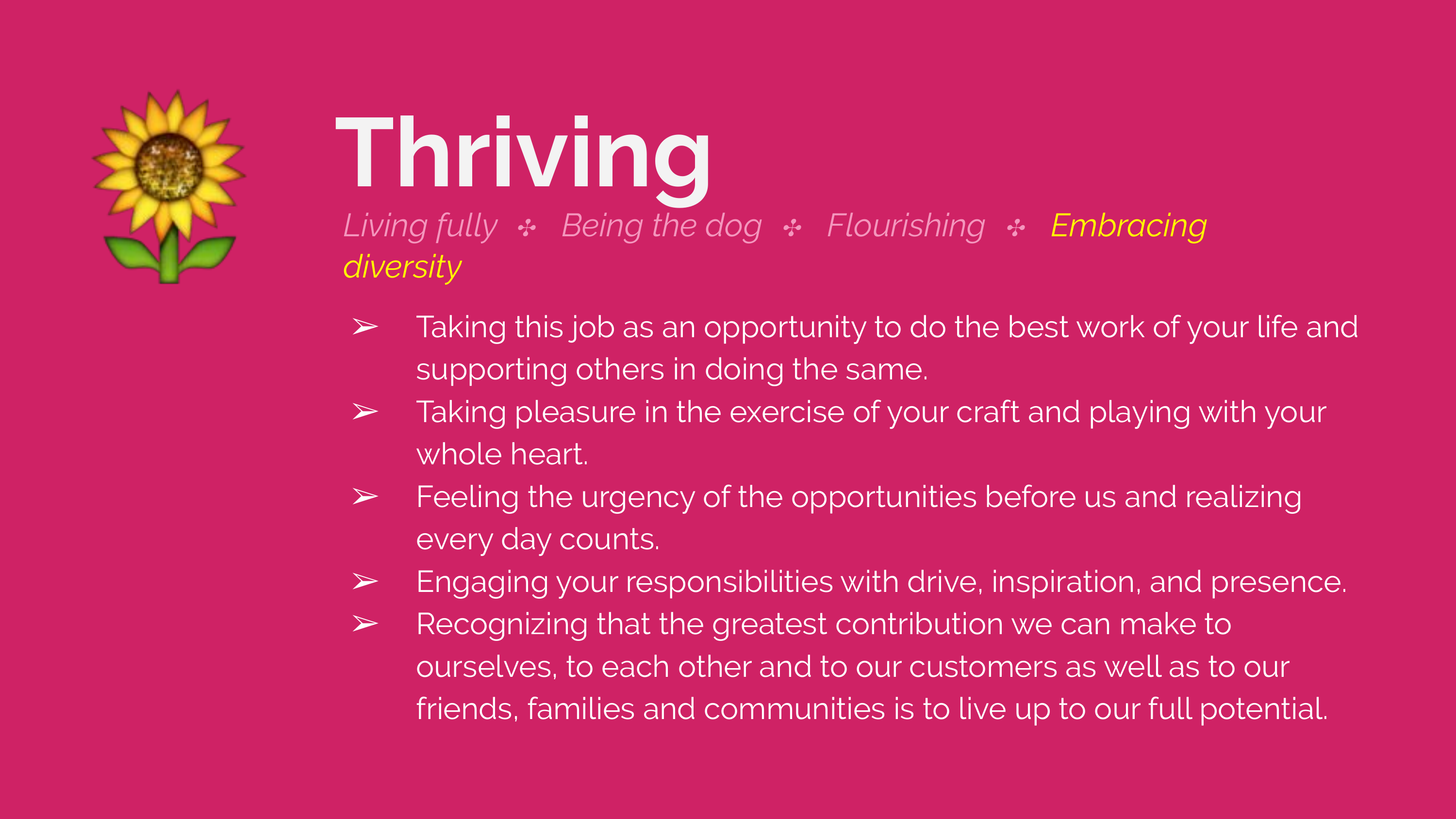 Now in interviews when candidates asked what it was like working at Slack, I heard myself say “the expectation is you’ll come here and do the best work of your life” — a line pretty much straight from the Thriving slide. When we had a disagreement in a conversation I found myself starting a reply with “Yes, and…” — a phrase that owed its origins to improvisational comedy and that was name checked on the Playfulness slide. The Six Slack Values got used pretty much every day at Slack.