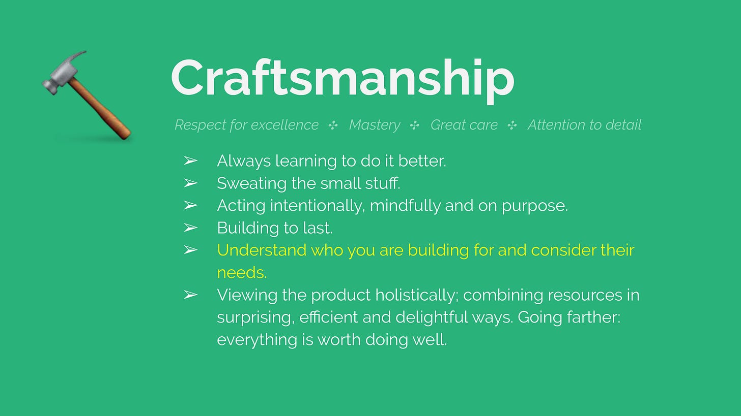 For the value of Craftsmanship, we wanted to go the extra mile for customers. The canonical story was about a cabinet maker who painted the back of the drawers. They didn’t paint the back of the drawers because anyone would ever see it. They painted the back of the drawers because they would know the job was fully done.