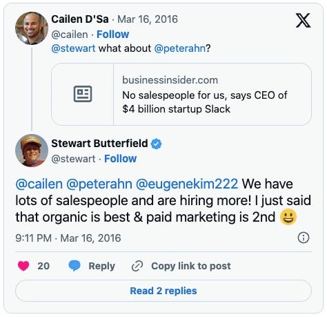 Secondly, the Slack of 2016 was only 2 years into having a commercial product available and many parts of the organization still felt very development-driven. “Doesn’t the product just sell itself?” was a question I had answered many times to internal folks who saw the success of some of our product-led growth. Why did we need sales people?