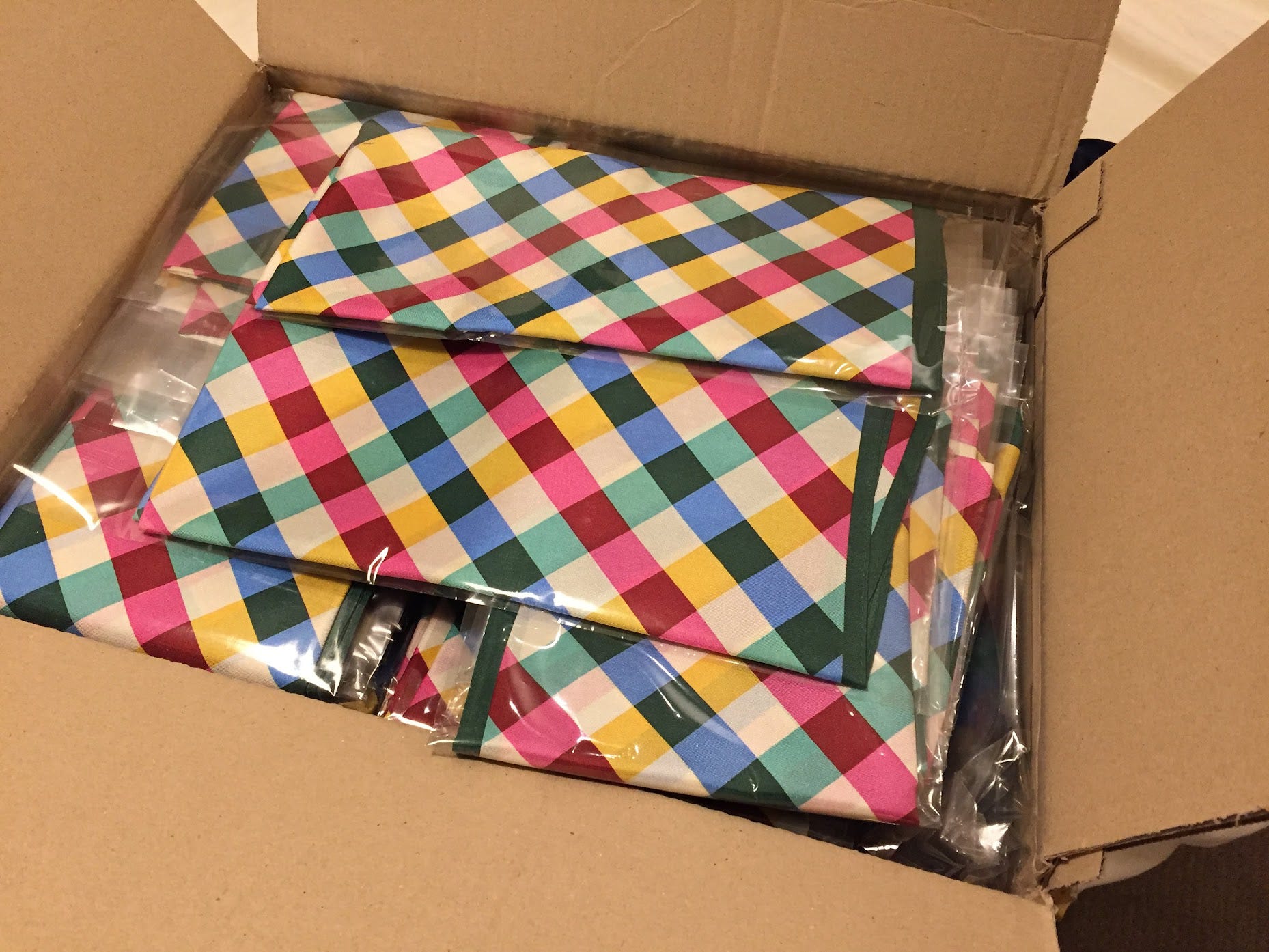 We got to an agreement on the details. On January 23, 2018, I called Jaspal and read him my credit card number. A few weeks later a box arrived to our Vancouver office filled with 250 Slack pocket squares. At least, that’s what I thought they were.