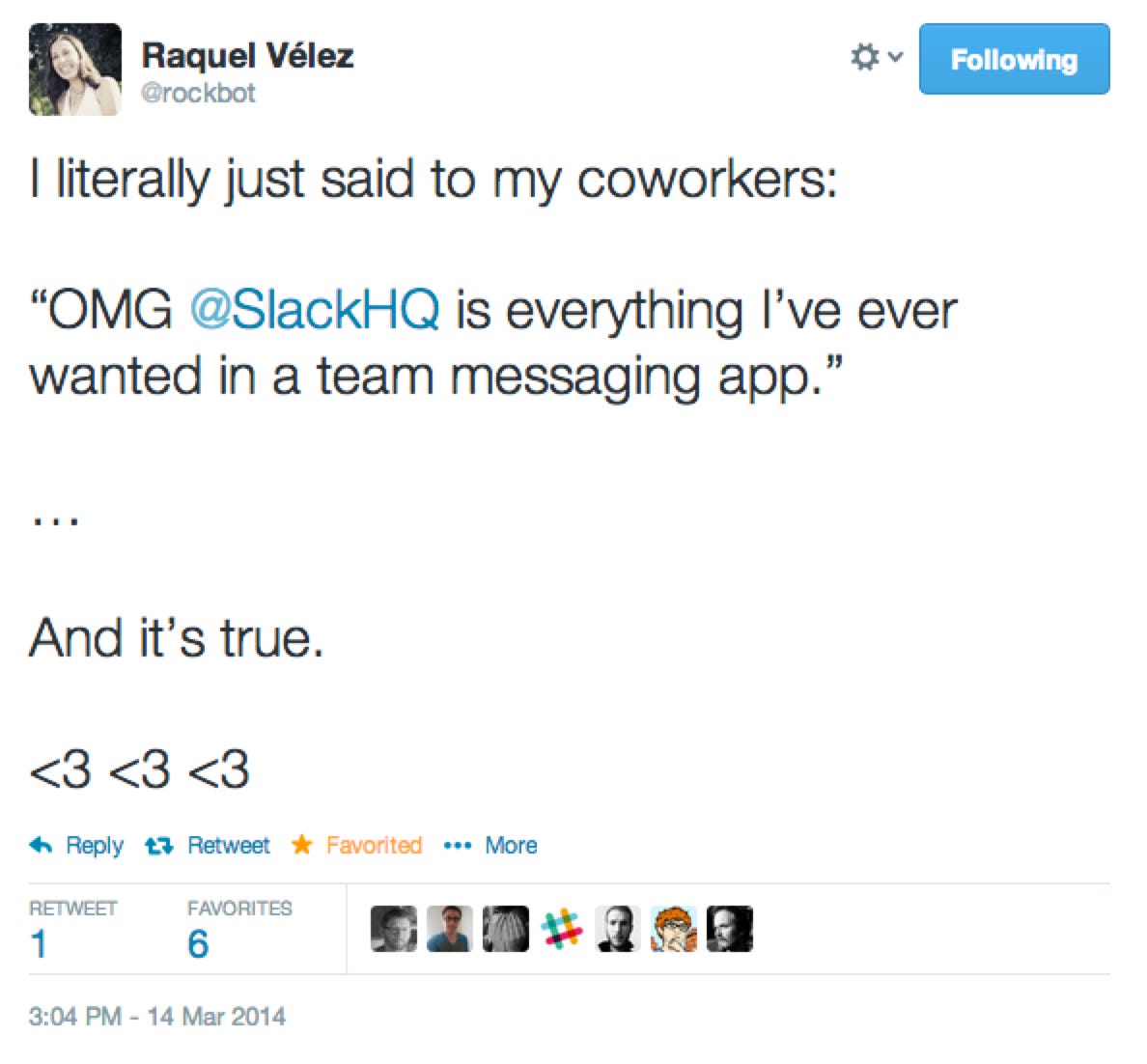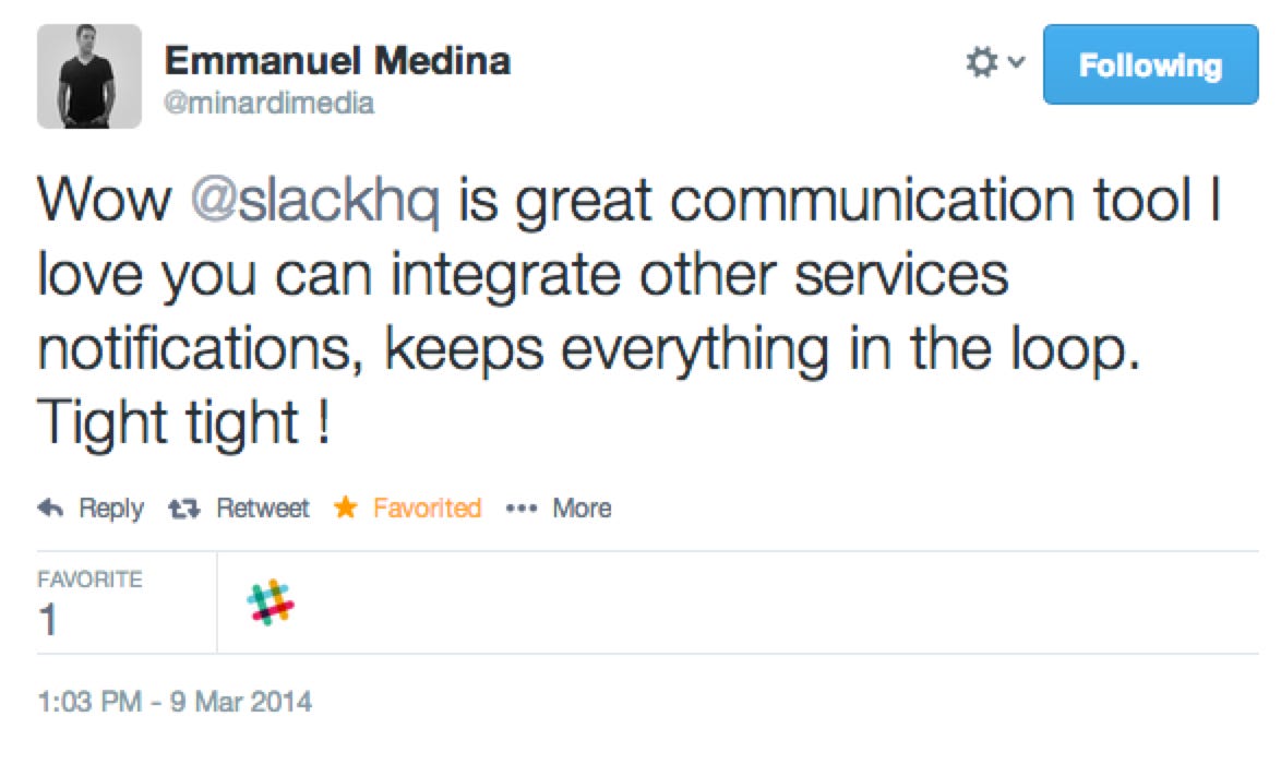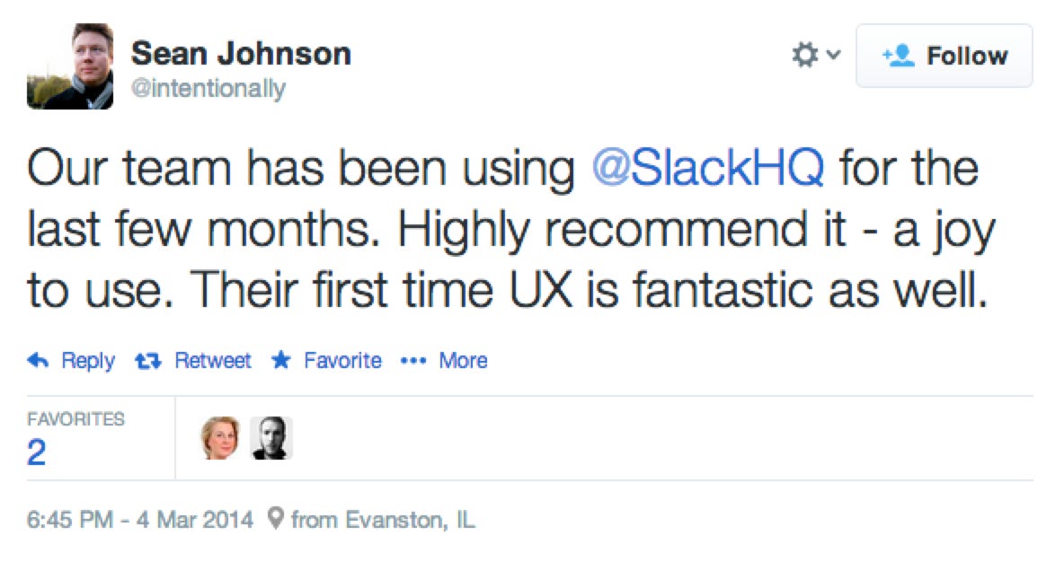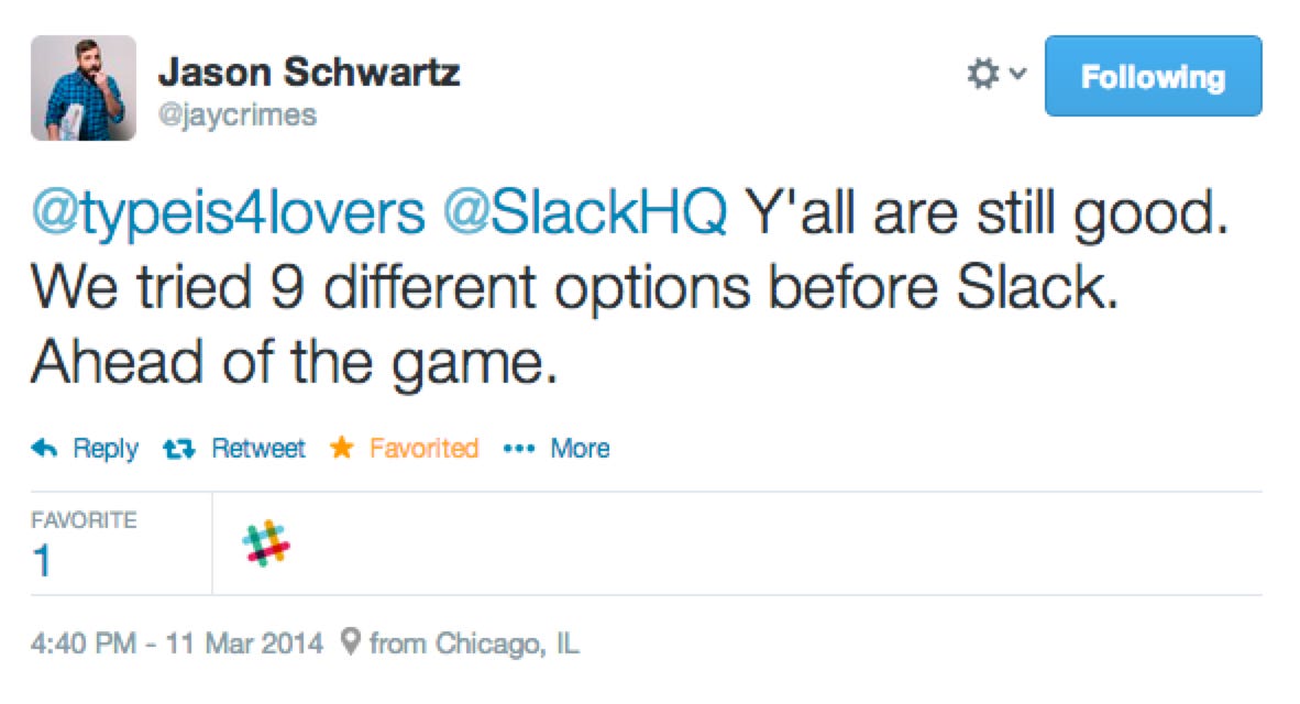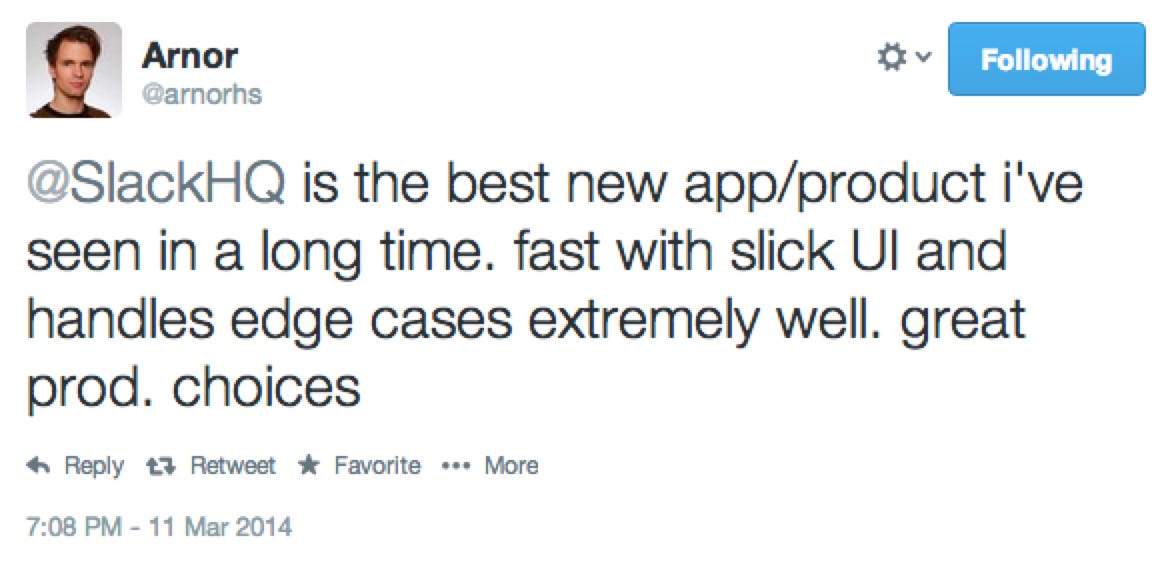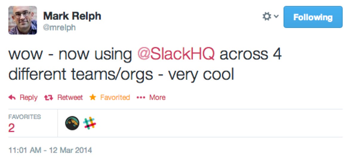 As @slackhq excelled at the Twitter game and as we launched Slack the product, folks began to reply and share their experiences as Slack users. This gave us a very strong pulse on the feedback of tech nerds responding to our product. It also gave us a terrific marketing opportunity that emerged as we watched.