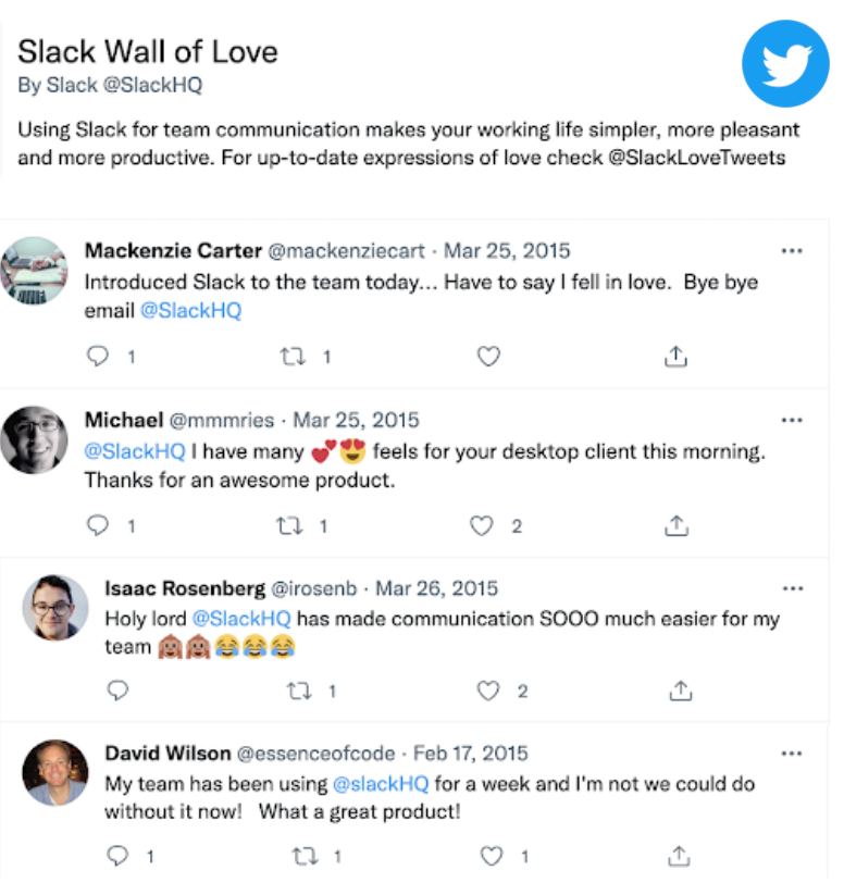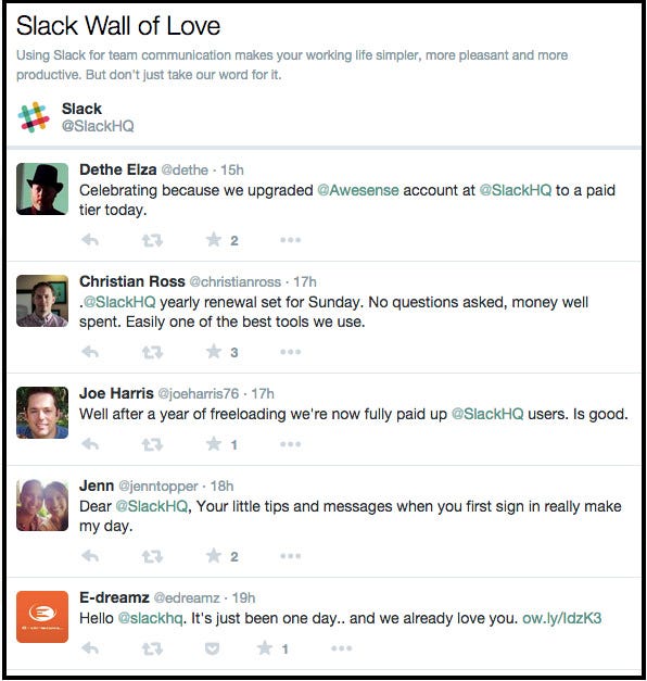 “I essentially joined Slack because of the Wall of Love. I saw it on the homepage when I was considering joining and it blew my mind. Here was a company that just shared exactly what their customers said.”