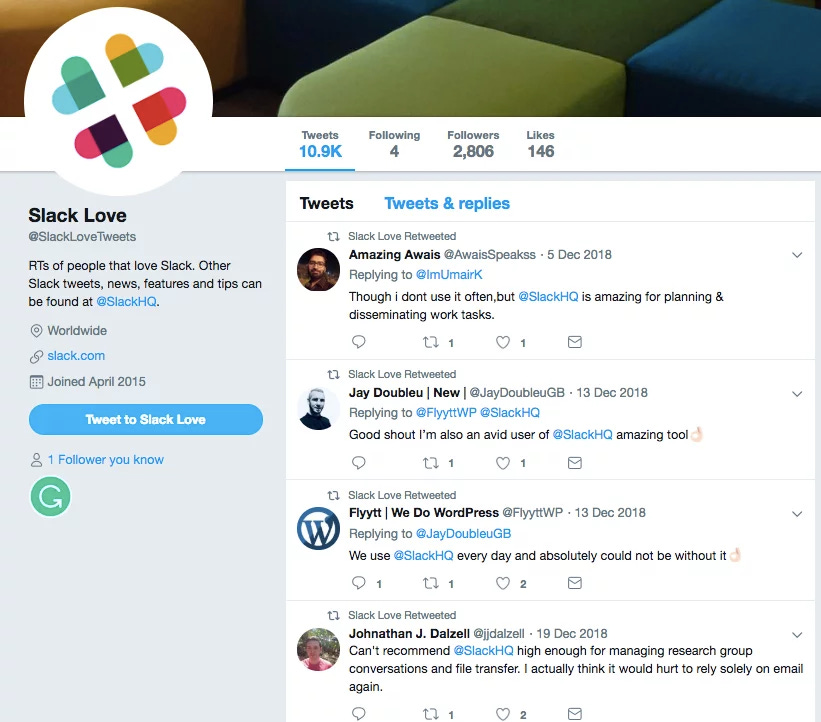 I can’t remember if Matt created @SlackLoveTweets because Twitter killed the Collections product or the Slack Wall of Love simply outgrew it. No matter. Matt took over and created a dedicated new Twitter account — All Slack love all the time.