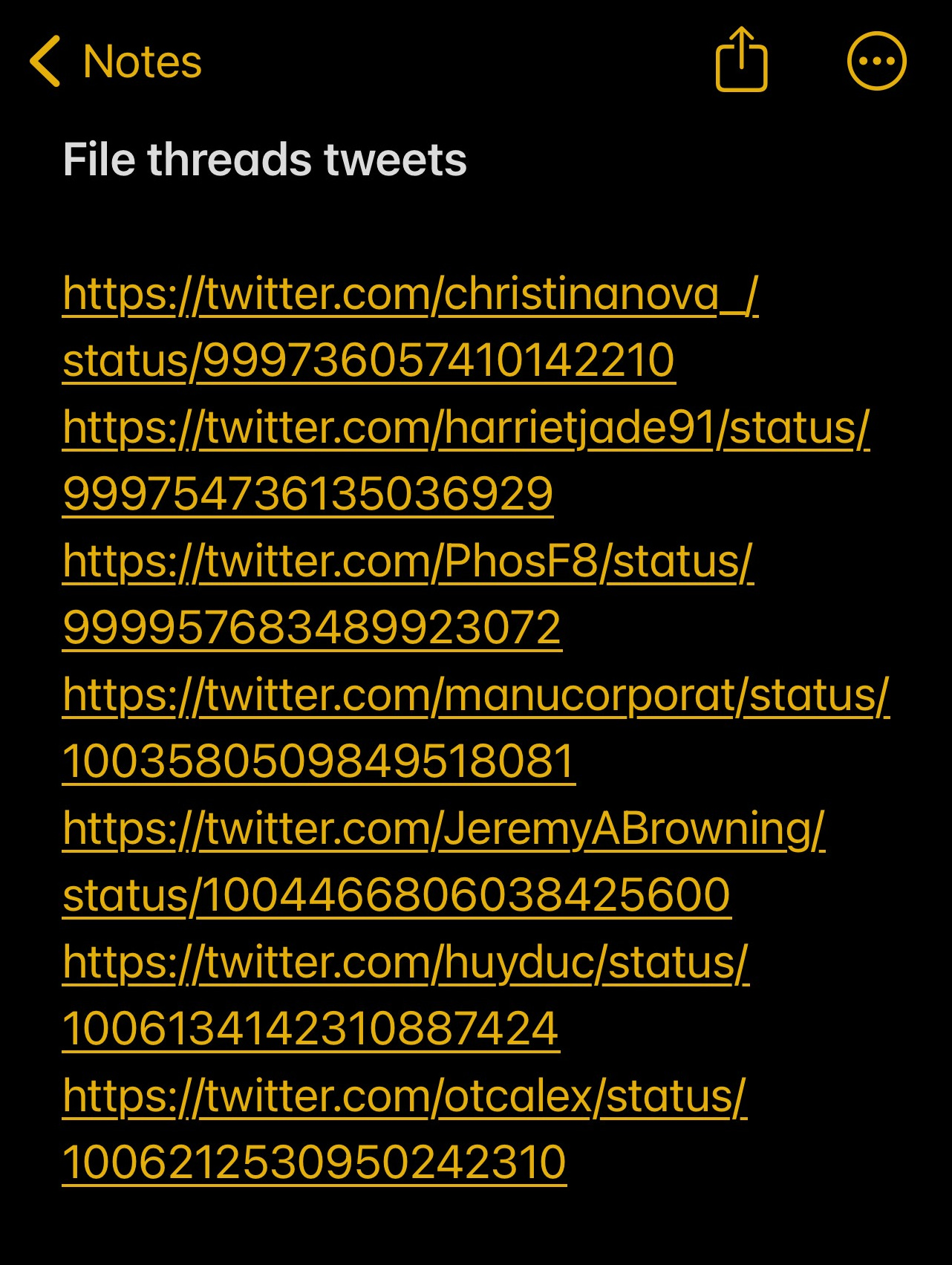 As with most everything, at first we said no nicely. We appreciated the input and thanked them for it. But people still requested things. So Matt collected those requests in a simple Notes file and shared the collected feedback with our product team as evidence of a feature’s desirability. Here’s a screenshot of his Notes file for threaded file comments.